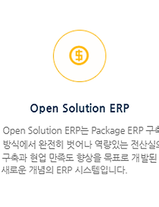 전산실이 있음에도 불구하고 ERP 패키지 제품을 구매할 수 밖에 없었던 국내의 ERP 도입환경에 개선이 필요하다고 판단하여 국내 ERP 시장의 변화를 이끌어 나가기 위해 Open Solution ERP 컨소시엄을 설립하여 업종특화 ERP 시스템을 공급하고 있습니다.