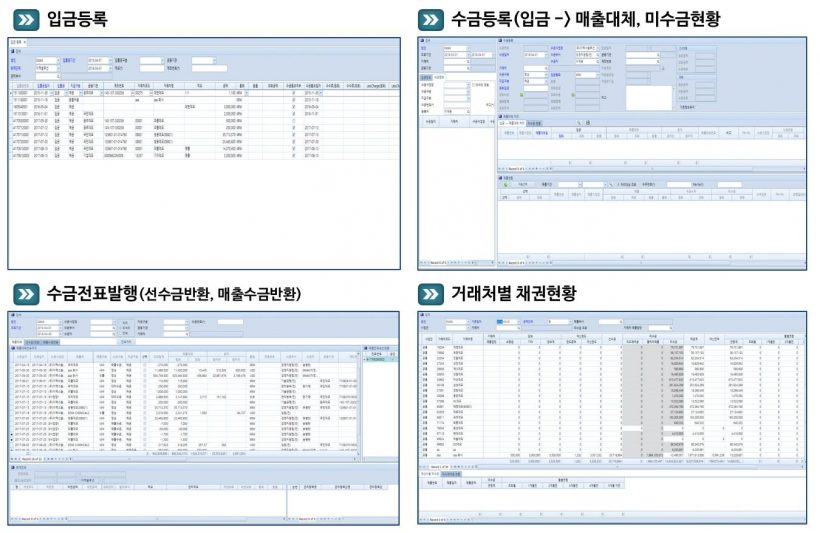 수금 처리 시 미수금 현황을 화면에서 직접 확인하면서 월별연령을 첵크할 수 있으며, 선수전환에 대한 업무도 기간별 거래현황을 기반으로 처리할 수 있으며, 기타 발생문서를 입력하여 관리할 수 있습니다.