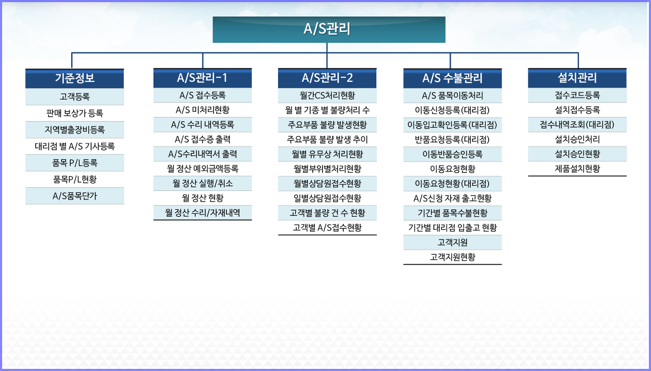 본 모듈은 전자 제품 및 기타 제품 등의 A/S 관리에 필요한 전체 업무를 포함한 시스템입니다.