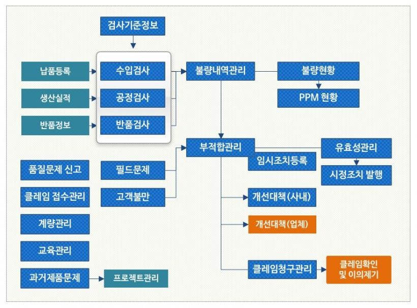 검사결과를 근거로 관련공정에 피드백할 수 있도록 하며, 의견/불만에 대한 조치결과 및 공정 반영내용을 관리하고, 수집된 품질정보 분석기능을 통해 문제점 파악 및 개선요소 제공을 용이하게 관리할 수 있습니다.