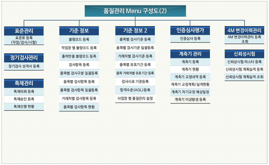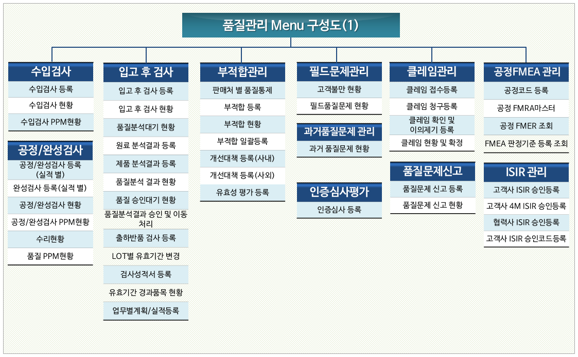 현대.기아자동차에서 도입한 그랜드 5STAR 품질관리를 인증받은 기업에서 활용하고 있는 솔루션으로 ERP 전체 모듈을 기반으로 하여 연동 개발되었으며, 내부 품질관리는 물론 5스타 관련 인증에 대한 다양한 모듈을 포함하고 있습니다.