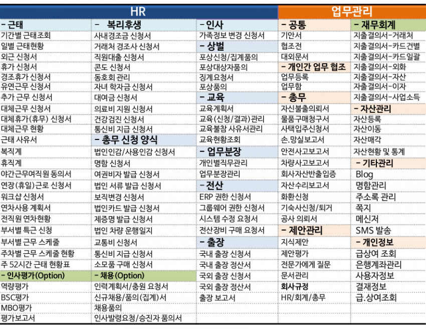 기업마다 ESS 기능의 사용은 그 범위가 다릅니다. 기존에 부서와 부서 간에 사용하는 업무가 다르고 사용법이 다르며, 연계 방안이 모두 다르기 때문입니다. 이렇게 다양한 기업의 모든 업무에 적용할 수 있도록 하기 위해 매우 다양하고 고도화 된 모듈을 제공하고 있습니다.