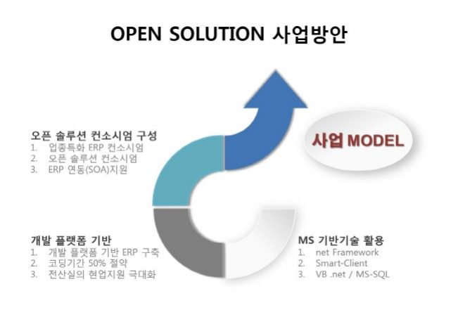 EMAX 의 ‘Open Solution ERP’ 시스템 사업방향은 Microsoft의 개발 Tool을 활용하고, 자체 개발한 개발 플랫폼을 구축하여 다양한 업종특화 ERP 시스템을 개발하여 공급하며,