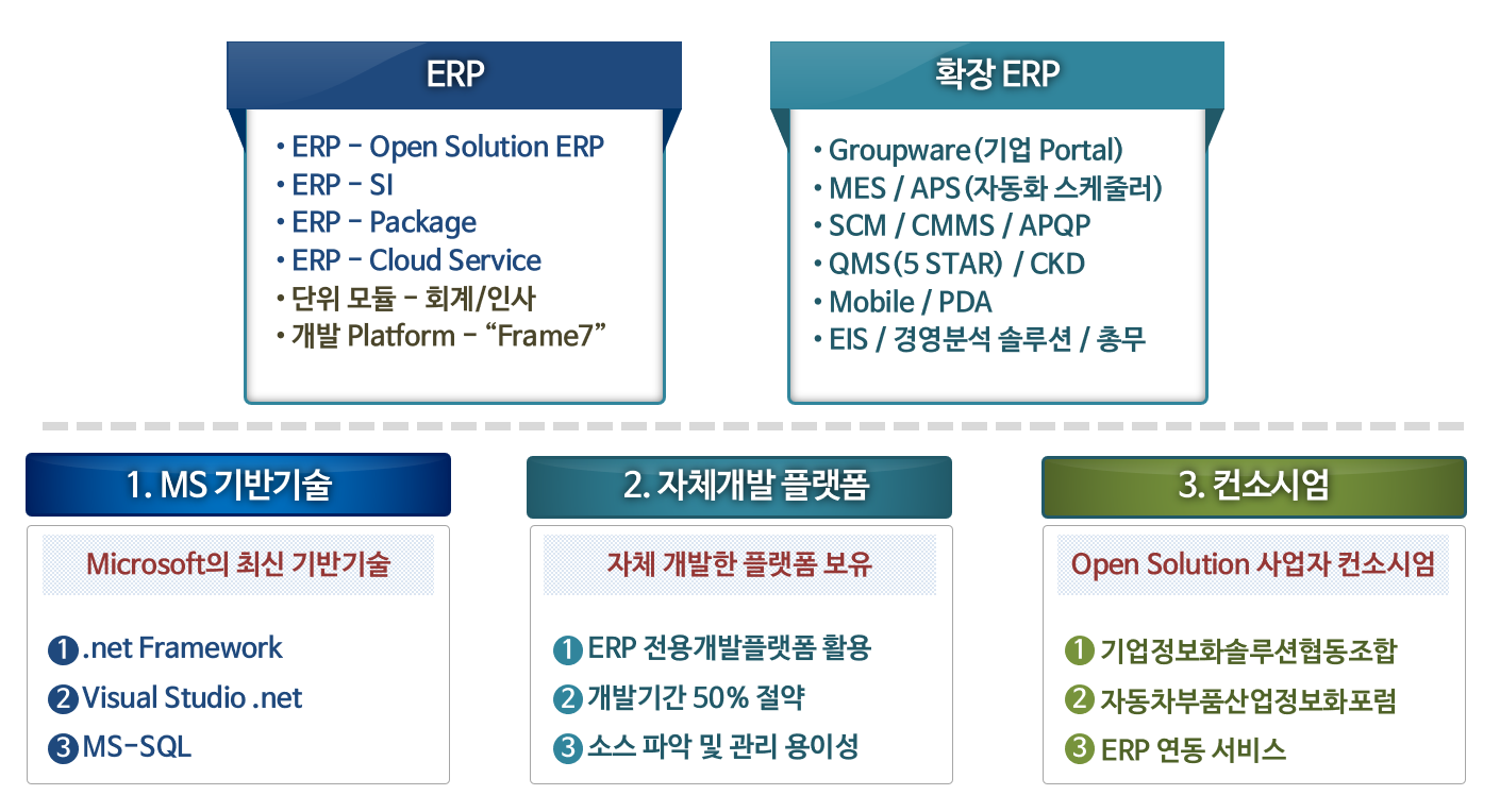 Open Solution ERP 시스템은 .net 기반에 MS-SQL을 활용하여 구축하였으며, 자동차 부품, 전기/전자 조립, 화학 등 BOM 기반에 적합한 산업에 맞게 개발 되었습니다.