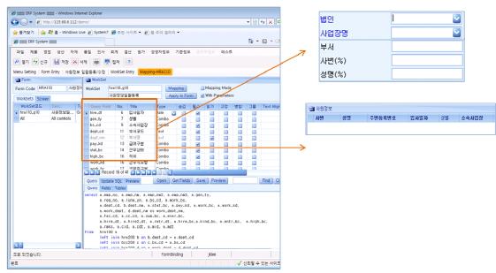 • 화면의 Mapping 버튼을 누르면 SQL문의 컬럼과 화면 컨트롤을 자동으로 Mapping 처리하며, 수정도 가능하다.