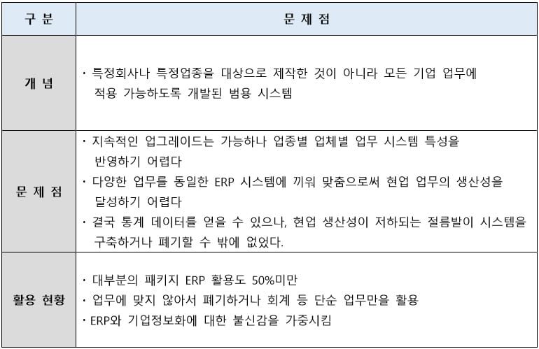 하지만, 10년 이상이 흐른 현대의 시점에서 돌이켜 보면 다양한 실패사례와 사용자 만족도의 부족 등으로 많은 기업에서 Package ERP 시스템의 문제점을 지적하고 있습니다.