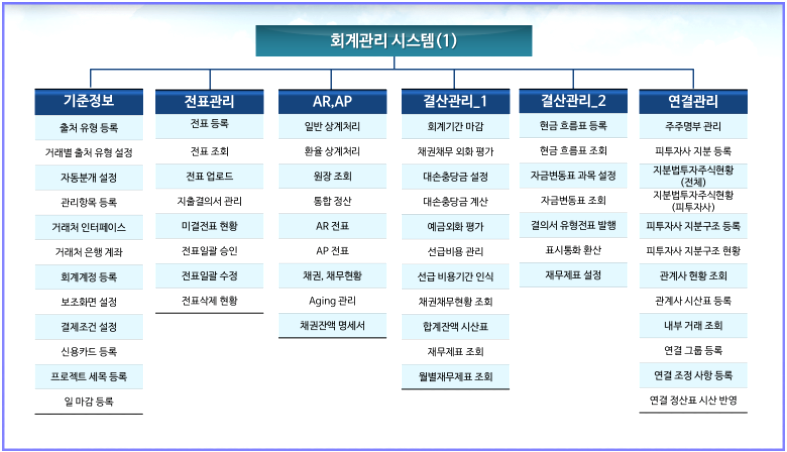 이맥스 회계시스템의 표준적인 재무회계 시스템 메뉴 구성도입니다.