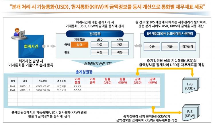 총계정원장에서도 기능통화, 현지통화 관련 환율을 적용하여 금액관리를 동시에 처리해야 하고, 현지통화의 금액정보를 집계하여 재무제표를 작성할 수 있도록 지원할 수 있어야 합니다.