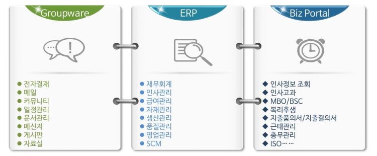 설루션 간의 경계가 사라지면서 많은 설루션의 모듈이 ERP 기능으로 제공되고 있습니다. 그동안 그룹웨어를 통하여 제공되던 ESS 기능은 ERP와 통합 제공되는 그룹웨어 및 전자결재 시스템을 통하여 많은 기능이 제공되고 현장 프로세스를 개선하고 업무 생산성을 향상하고 있습니다.