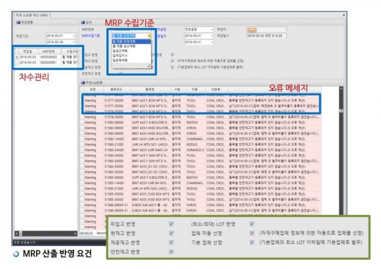 MRP를 산출하기 위한 반영 조건으로 미입고 반영, 현재고 반영, 재공 재고 반영, 안전재고 반영, 최소/최대 LOT 반영, 업체 자동선정, 기본 업체 선정 등의 조건 선택을 통해 발주 수량을 산출하며, 이러한 산출 작업을 차수화하여 여러 조건에 맞게 산출할 수 있도록 지원하고, 품목별로 미흡한 발주정보 발생 시에는 오류 정보를 제공하여 정확한 산출량을 계산해 낼 수 있도록 해야 합니다.