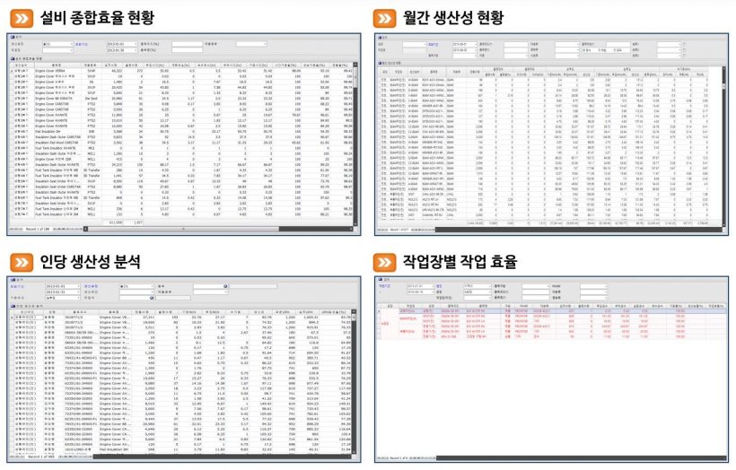 생산 계획 대비 실적, 공정간 생산 실적, 투입되는 생산요소의 총산출을 통하여 설비 및 투입 인력의 노동 생산성에 대한 분석과 생산에 미치는 요인을 파악하기 위해 투입 대비 실적에 대한 다양한 분석을 실시합니다.