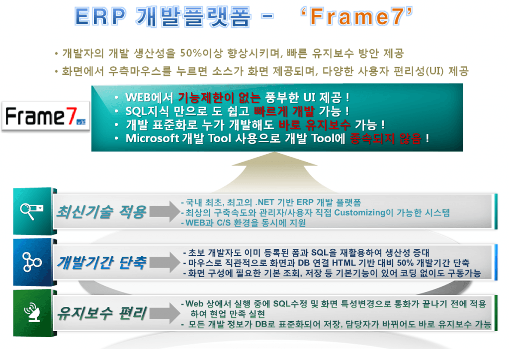 이렇게 개발(코딩) 생산성을 50% 이상 향상시키고, 구축 후 전산실의 자체적인 유지보수 환경을 최적화 시켜 주는 시스템은 국내에서 ’Frame7′ 이 유일합니다.