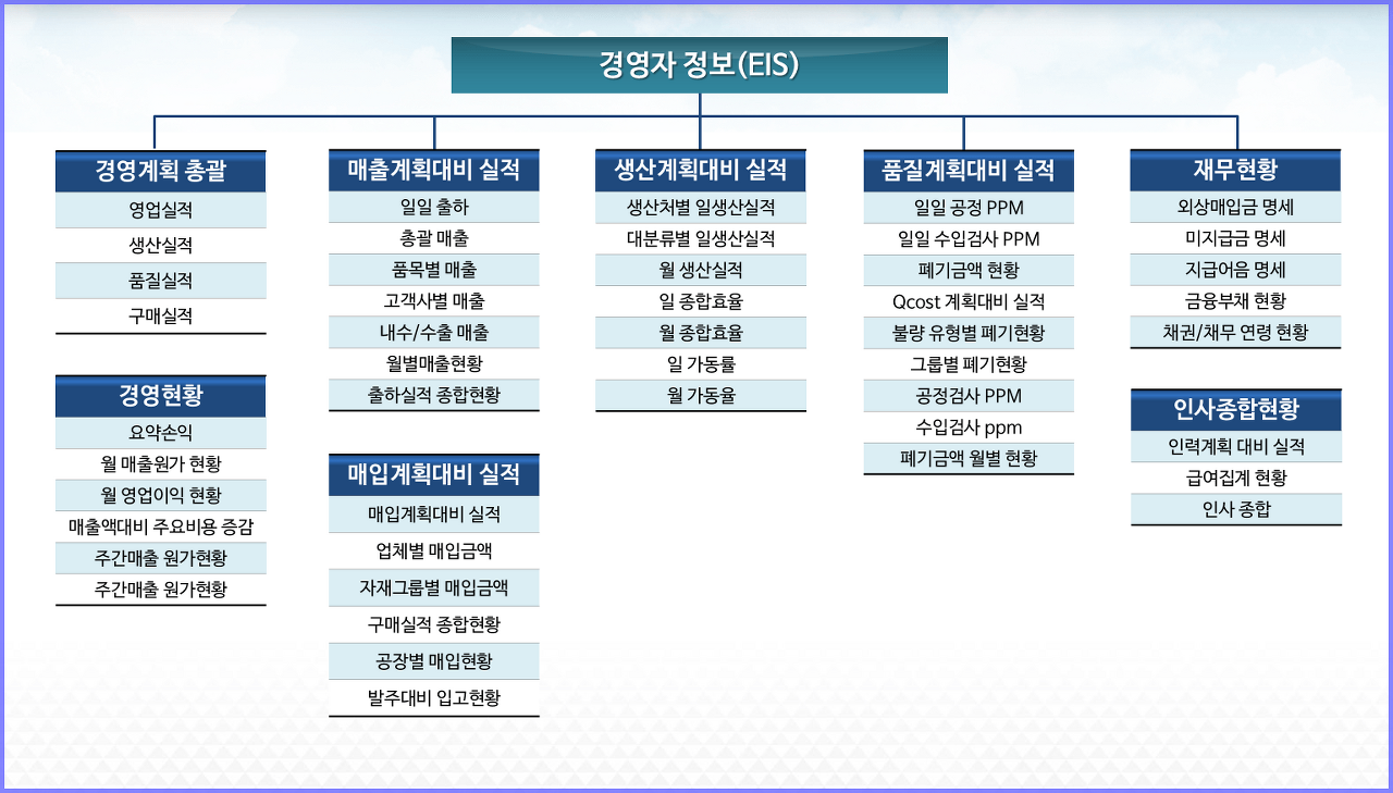EIS 시스템은 기업마다의 특성을 반영하여 다양한 정보를 제공할 수 있도록 구성하며, 구축한 모듈 전체에 대한 정보를 대상으로 기업운영 형태에 맞도록 재 구축하여 제공합니다.