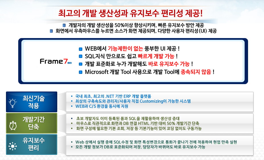 최신의 .net 기반 기술을 활용하며 WEB과 C/S(자체 브라우져)를 한 번의 개발로 해결하고, 코딩 자동화를 통한 50% 이상의 개발 생산성 향상 및 개발기간 단축, 탁월한 유지보수 편리성 등은 ‘Frame7’만이 보유하고 있는 기술력입니다.