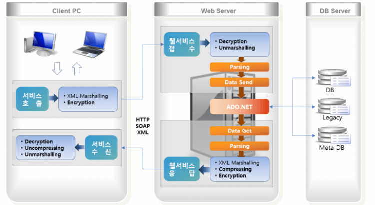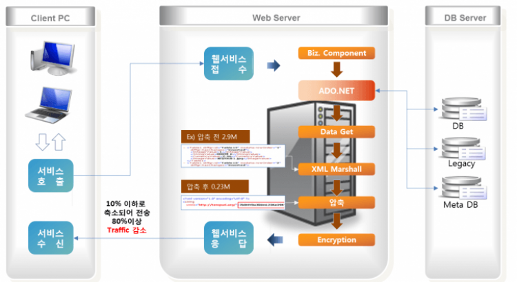 WEB Server 와 DB Server를 통합 및 분리 구축할 수 있으며, XML 기반의 압축 전송을 통하여 10% 이하로 축소되어 전송되며, 트래픽이 약 80%정도 감소되는 효과를 제공합니다.