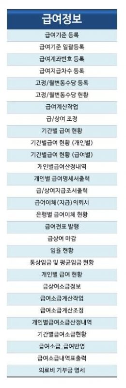 최종 계산 후에도 급.상여 조정이 가능하여야 하며, 이러한 결과를 기반으로 급여.인사.근태 등의 현황을 제공할 수 있는 Dash Board, EIS 등의 자료 제공은 기업 관리에 있어 많은 도움이 될 것입니다.