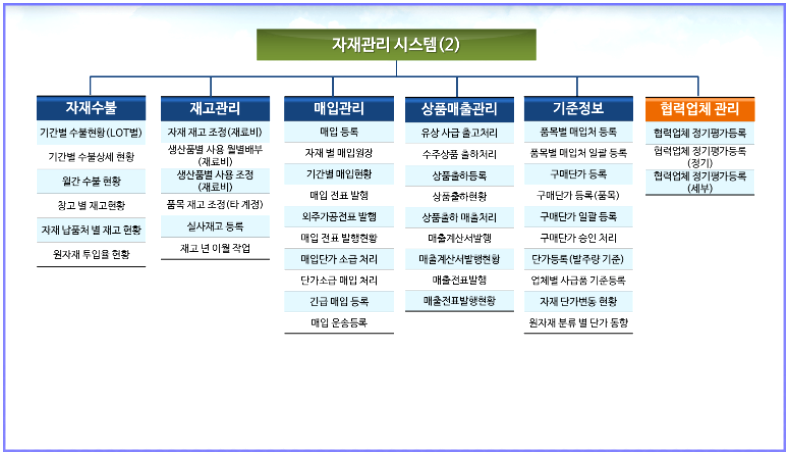생산계획과 원부자재 재고와 연동시켜 효율적인 자재 소요계획이 수립될 수 있도록 자동 Rescheduling 시스템을 구축할 수 있도록 지원하며, 자재사용실적을 실시간 입력/수집하여 각종 집계자료로 활용하며, 구매실적/입고실적/출고실적를 일일 정산체제로 구축하고, 월별 자재비 산출, 재고 일수를 분석하여 적정재고 보유기준을 관리하며 필요정보를 결산/분석/계획수립에 반영하기 위해 통계정보로 유지/관리를 지원합니다.